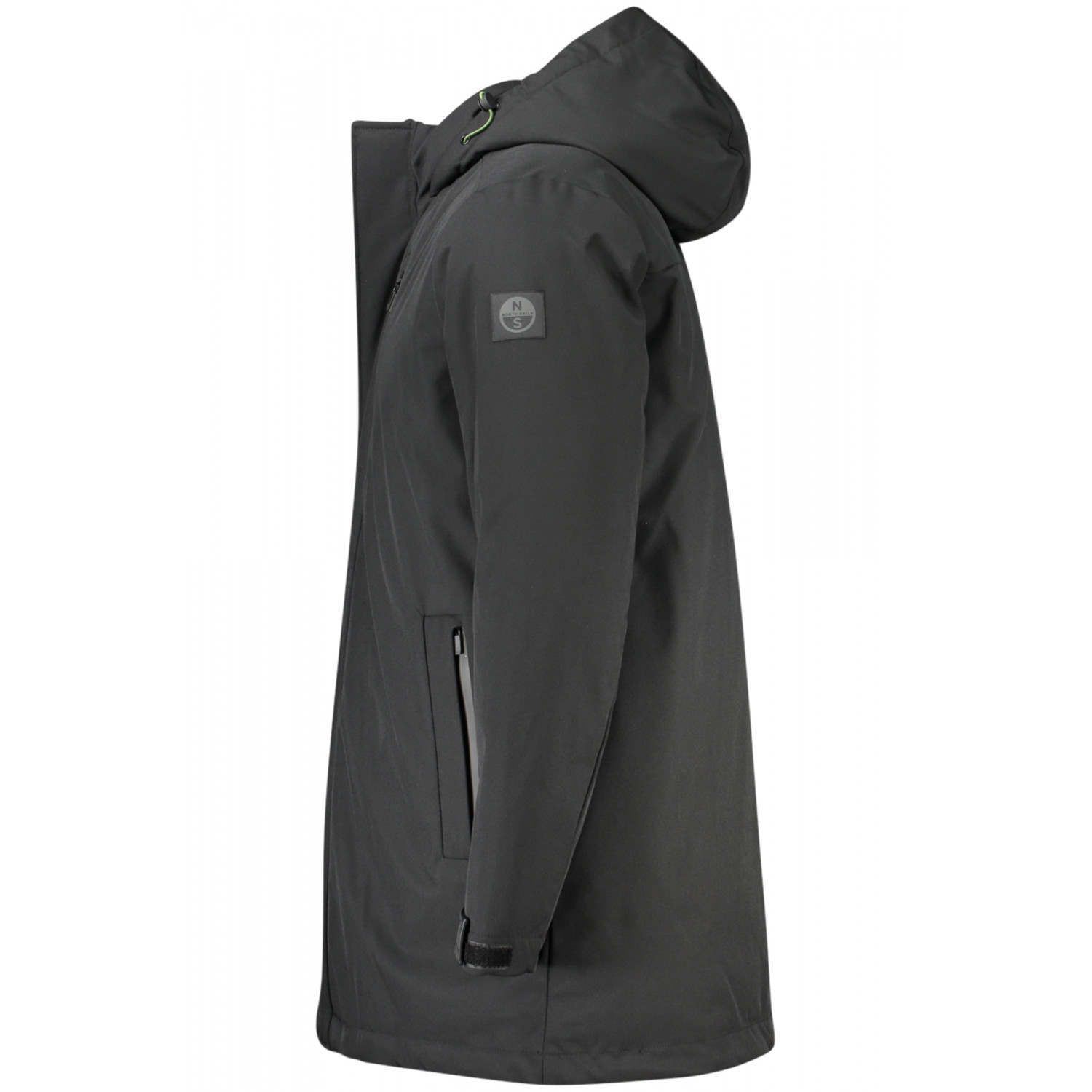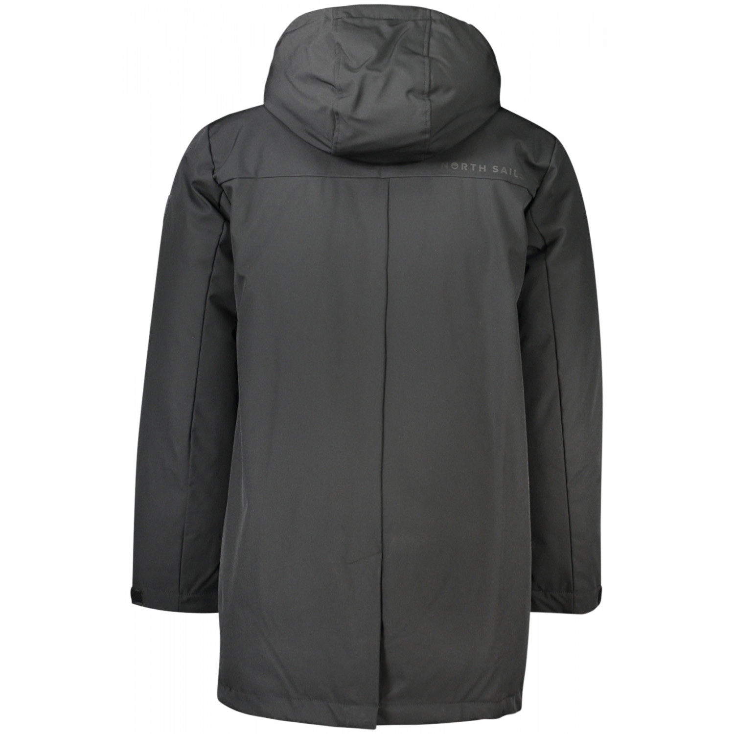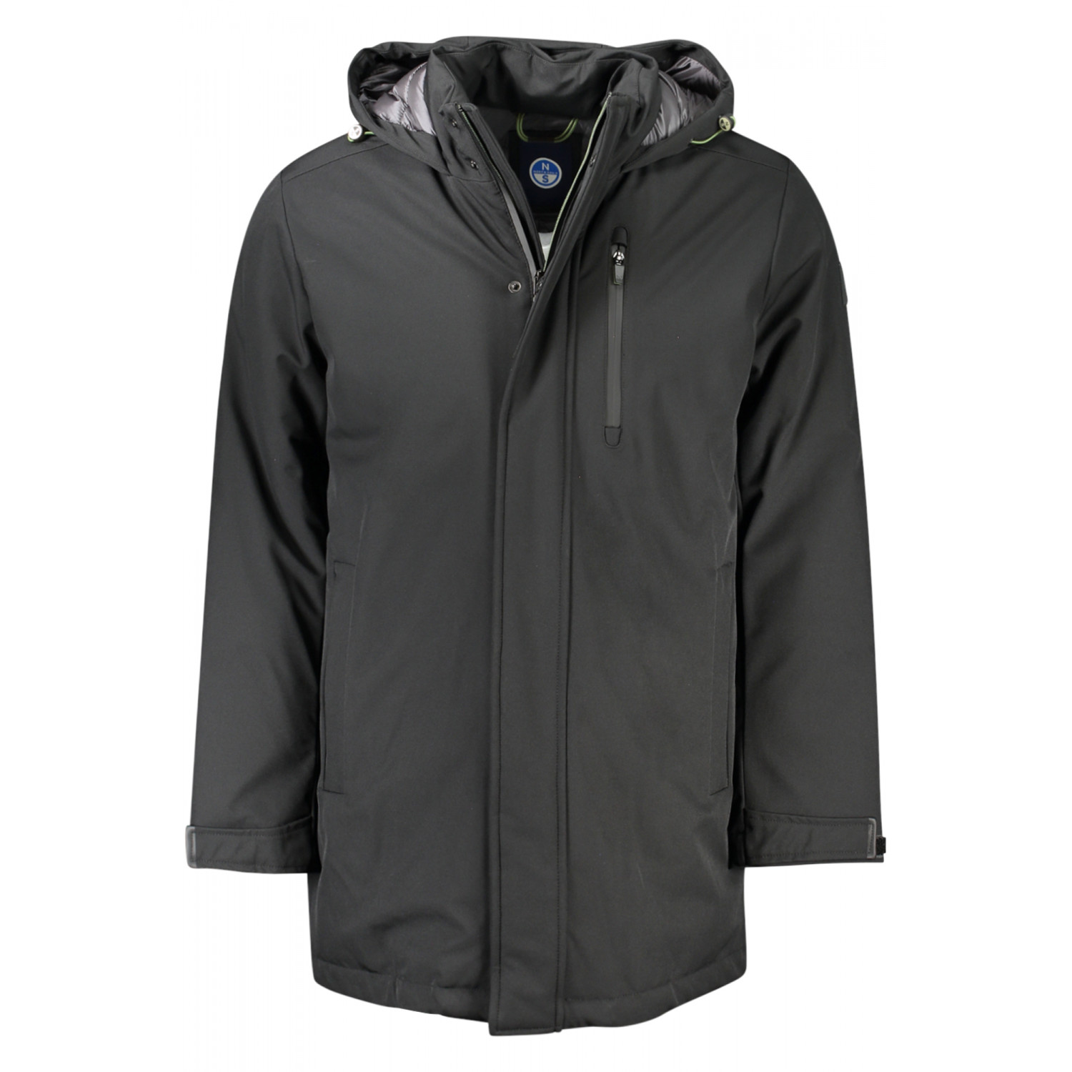 CHAQUETA LARGA, MANGA LARGA CON CAPUCHA, 3 BOLSILLOS EXTERNOS, 2 BOLSILLOS INTERNOS, CREMALLERA, BOTONES, APLICACIÓN, LOGO, BOTELLAS DE PLÁSTICO RECICLADO