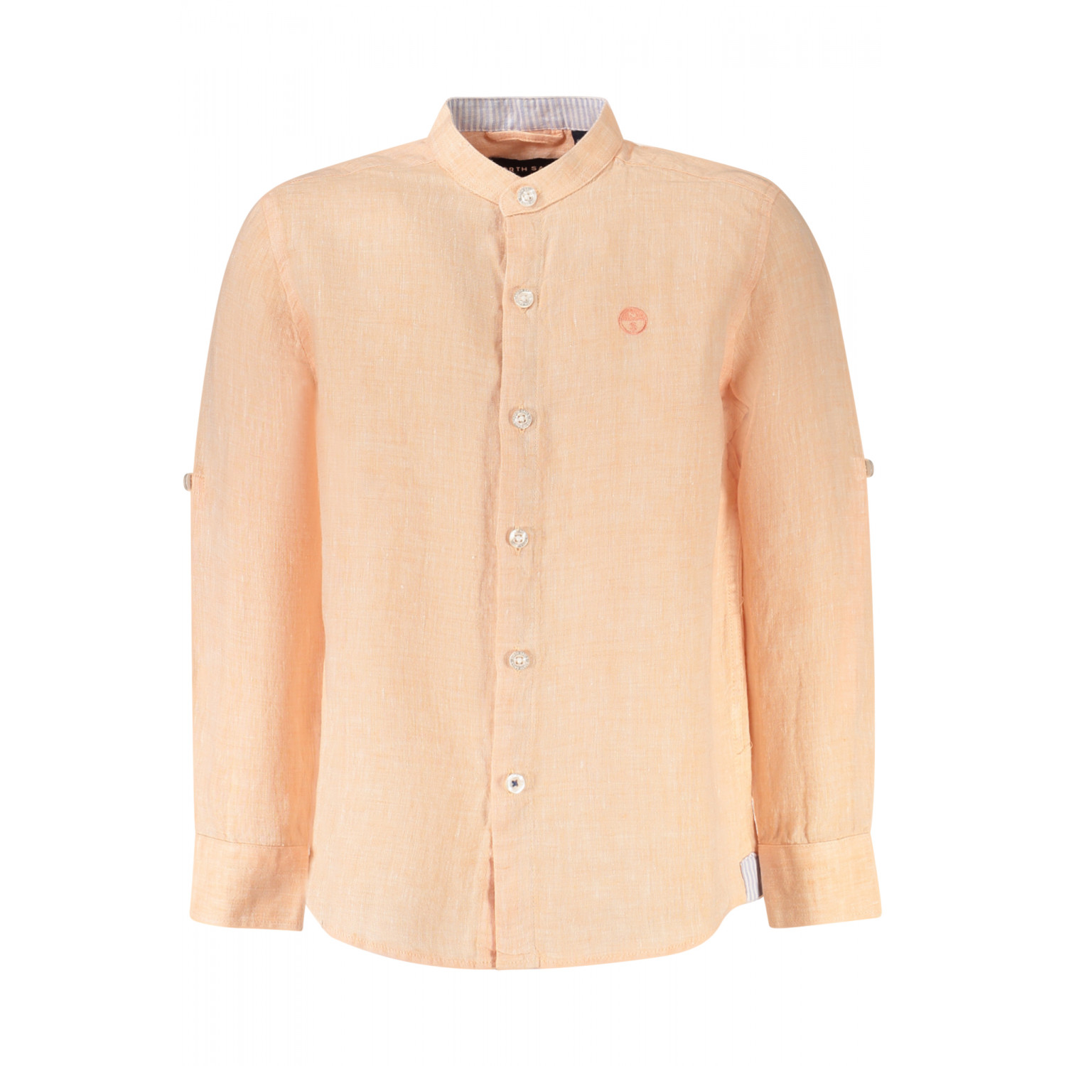 CAMISA DE MANGA LARGA, CUELLO COREANO, PUÑOS DE 1 BOTÓN, BOTONES, DETALLES EN CONTRASTE, BORDADO, LOGO, OCÉANO POSITIVO
